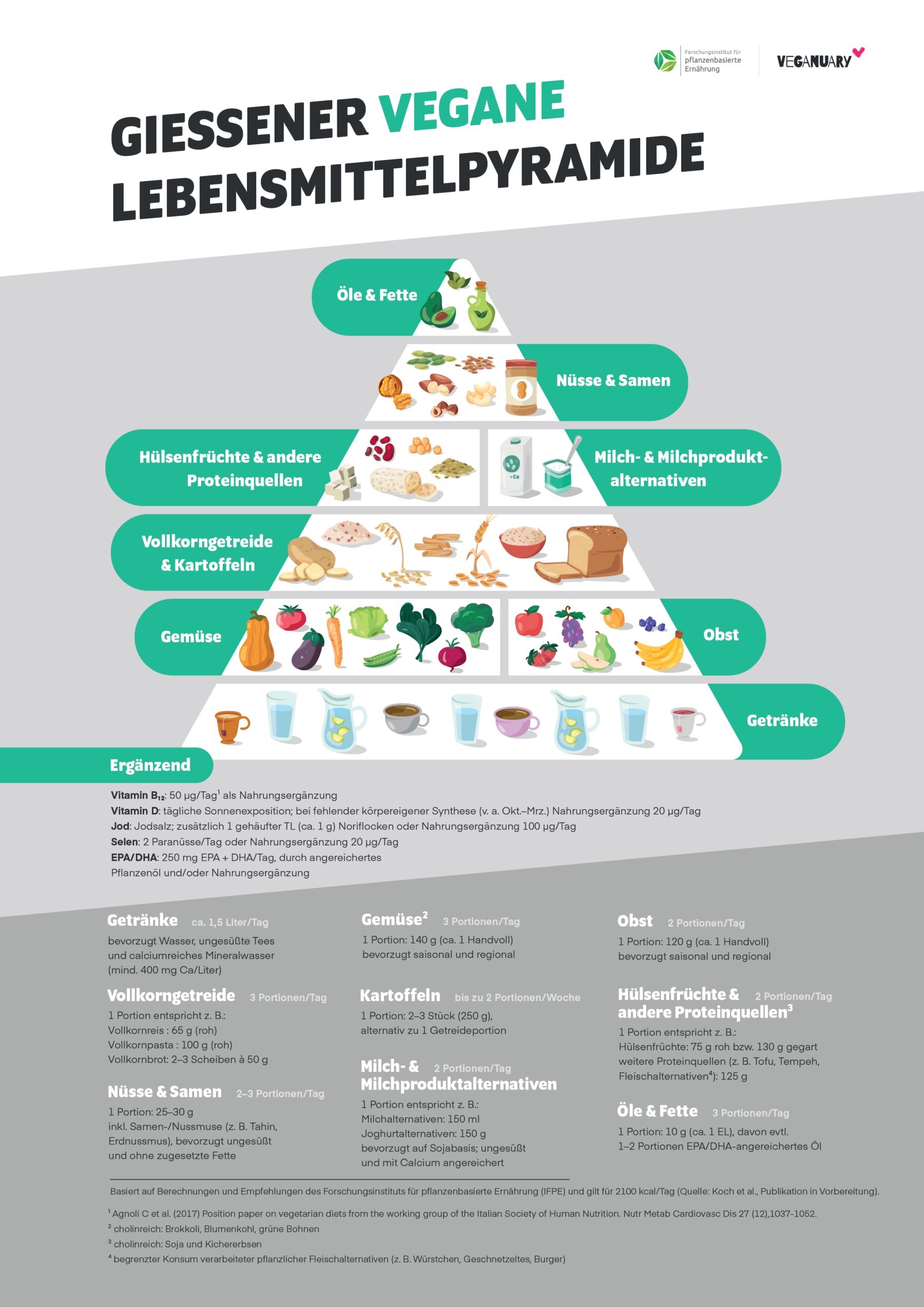 Die erstmals 2018 unter der Leitung von Dr. Markus Keller (IFPE) entwickelte Gießener vegane Lebensmittelpyramide (Weder et al., 2018) richtet sich an alle, die sich pflanzlich ernähren möchten – und bietet zugleich eine fundierte Orientierung für beratende Fachkräfte. Gemeinsam mit Veganuary wurde sie nun in einer 3. Auflage komplett neu aufbereitet. Sie fasst wissenschaftliche Ernährungsempfehlungen anschaulich zusammen und zeigt, wie eine pflanzliche Ernährung den Bedarf an Energie sowie an Makro- und Mikronährstoffen von gesunden Erwachsenen decken kann. Im Alltag unterstützt sie dabei, Mahlzeiten und Einkauf zu planen.