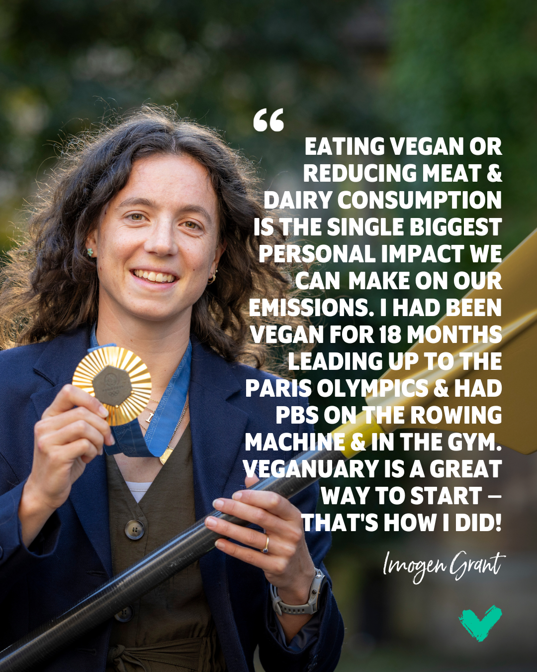 Lending her support to the Veganuary 2025 campaign, Imogen says: “Eating vegan or reducing meat and dairy consumption is the single biggest personal impact we can make on our emissions. I had been vegan for 18 months leading up to the Paris Olympics and had PBs on the rowing machine and in the gym. Veganuary is a great way to start – that’s how I did!”
